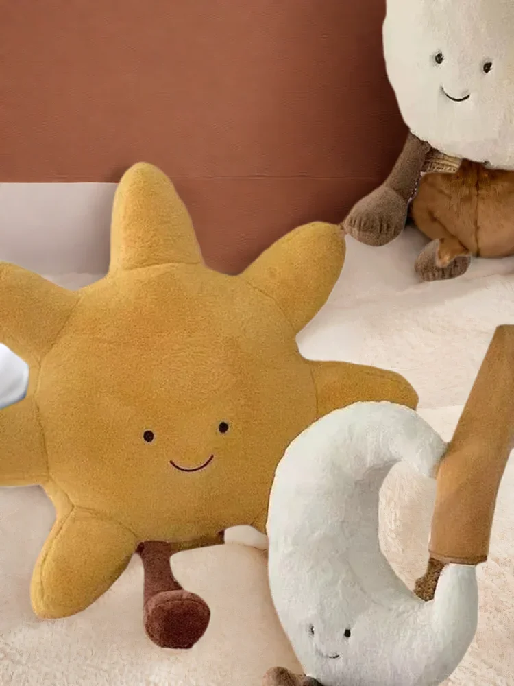 This adorable plush cushion features a smiling moon and a bright yellow sun, designed to bring warmth, joy, and comfort to any room. Its soft texture and friendly design make it ideal for both playtime and decoration.